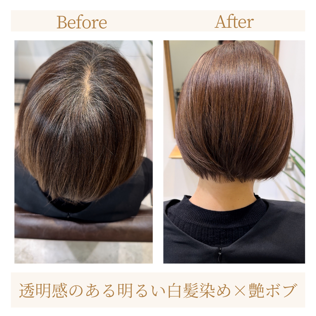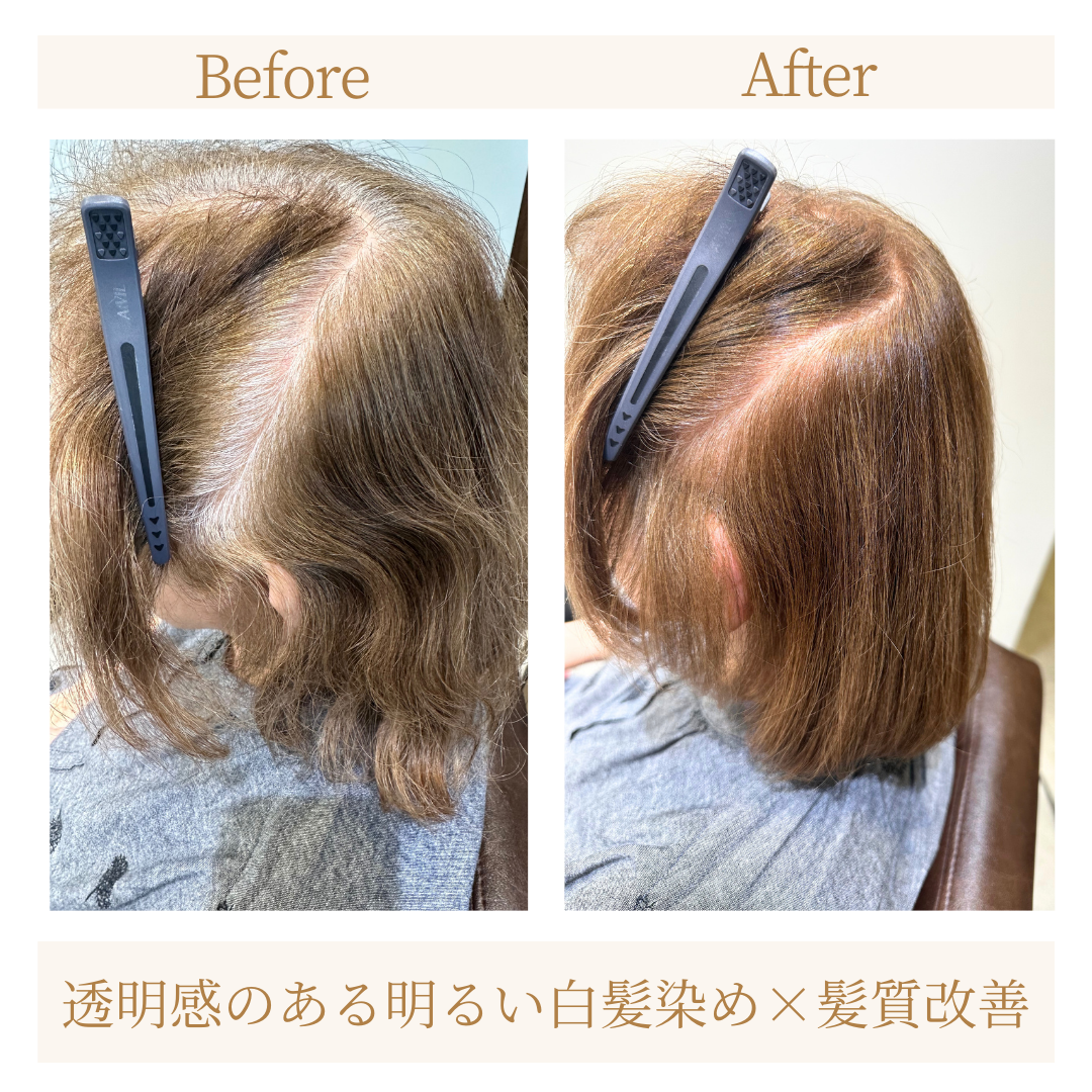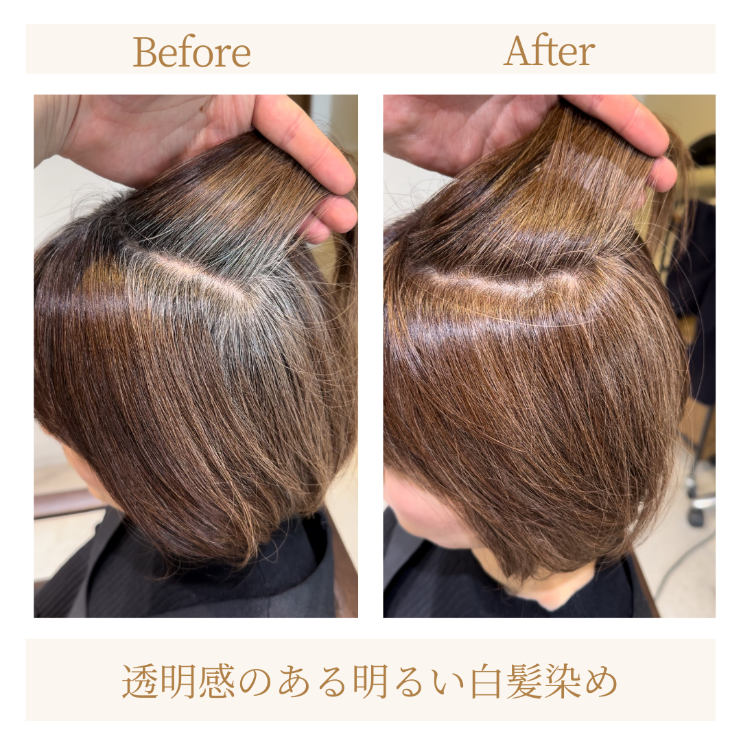 白髪を染めながら透明感のあるカラーにするには、薬剤のミックスの仕方が重要です。今回は希望の明るさに対して、2トーン明る薬剤と2トーン暗い薬剤をミックスして調整しています。また、透明感を出すためにアッシュ系の薬剤をチョイスしました。艶感を出す為に今回は保湿系のトリートメントをさせて頂きました^^SHARE SALON L